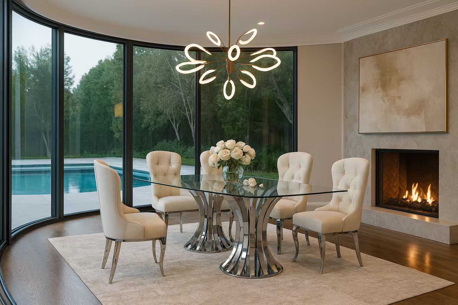 The Cavali Dining Set is defined by its striking, contemporary silhouette. The table features a thick, tempered glass top that offers a clear view of its most distinctive feature: the dual sculptural pedestal bases. Each pedestal is masterfully crafted from polished chrome vertical fins that flare elegantly at the base, creating a sense of movement and modern grandeur.