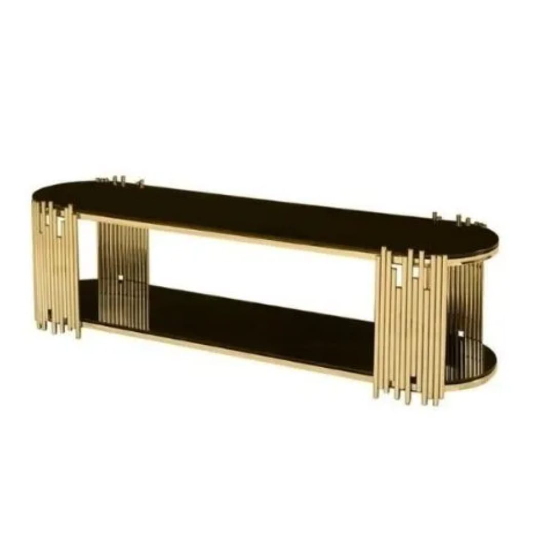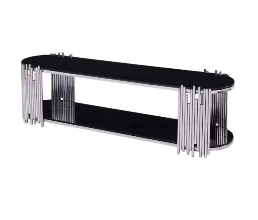 The Mirage TV Stand is sleek and elegant, with black tempered glass and silver/gold stainless steel stripes.
